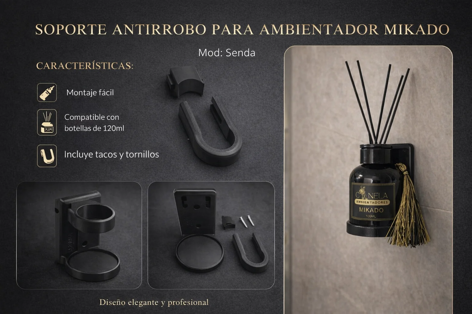 Soporte antirrobo para ambientador de varillas mikadoMikado de 120ml senda en color negro está diseñado para ofrecer una solución estética y funcional en entornos donde la seguridad y la presentación son clave. Fabricado con materiales resistentes y acabado elegante, este soporte permite fijar el ambientador a la pared de forma segura, evitando su manipulación o sustracción. Es ideal para aquellos lugares públicos donde haya peligro de que se lleven los ambientadores. También resulta ideal para autocaravanas o furgonetas camperizadas donde se pueden volcar.